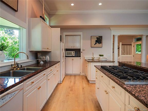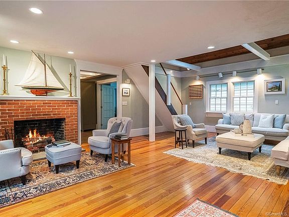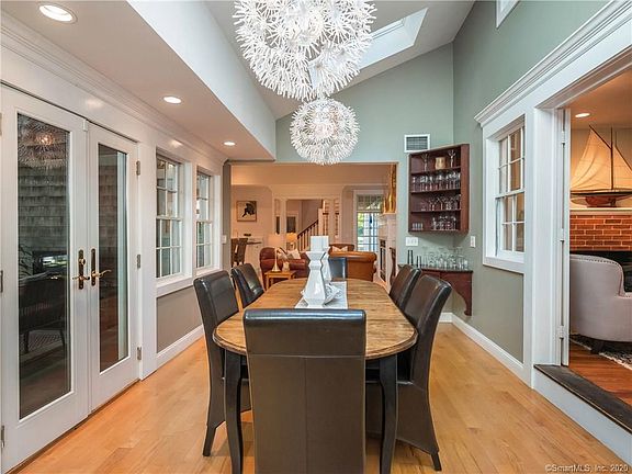 Located close to East Wharf Beach and Madison town center 36 East Wharf Road is set well back on the lot affording privacy and grace. This house started as a modest 1929 bungalow and, with an award winning architect's vision and skill, has expanded to become a wonderful, energetic, home with dramatic high ceilings, creative use of windows and skylights and dynamic architectural details . The flow in the house is very organic and works for large parties and intimate gatherings. This is enhanced via the superior indoor/out door connection: The over-sized Ipe deck, and blue stone patio at the front of the house, may be accessed by the main Foyer leading to the Family Room and Kitchen or the Bar room leading to the Living Room. Off the Dining Room, accessed by french doors is a large screened porch that is floored in blue stone which opens to a stone patio and looks out on the charming two-story, shingle style, potting shed. There is small "morning coffee" deck off the first floor master bedroom suite. In the original part of the house is another first floor bedroom that serves as beautifully as an office. Above the Living Room there is an Artist's Loft with skylight, storage and work sink. On the second floor is another master bedroom suite with large walk-in closet, second washer/dryer and bath with large tiled shower, large jetted tub and double sinks in a granite counter. A fourth bedroom, on the second floor, is enormous, has a gas fireplace, loft and seat in the large bay window. This house is easy to live in too! The over-sized two car garage has easy access to the kitchen which is a cooks dream with White cabinets, Island with breakfast bar and granite counters, a second bar sink, Viking six burner gas cook top and double ovens all with 12' ceilings and open to the family room. The grounds have been thoughtfully developed - The broad front lawn and majestic shade trees offer a gracious introduction to the property, the electrical service is underground, the gravel driveway with circle makes accommodation of many cars a snap. There are attractive border gardens and the gardens around the screened porch are serene. In pristine condition this home is available immediately.