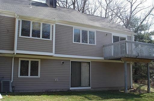 Bright and sunny end unit at Drummer Boy Homes for rent, 2 bedrooms, 2 full bathrooms, living room with fireplace, dining room with sliders to the deck and eat-in kitchen on the mail level, plus finished walk-out lower level. Great convenient commuter location.