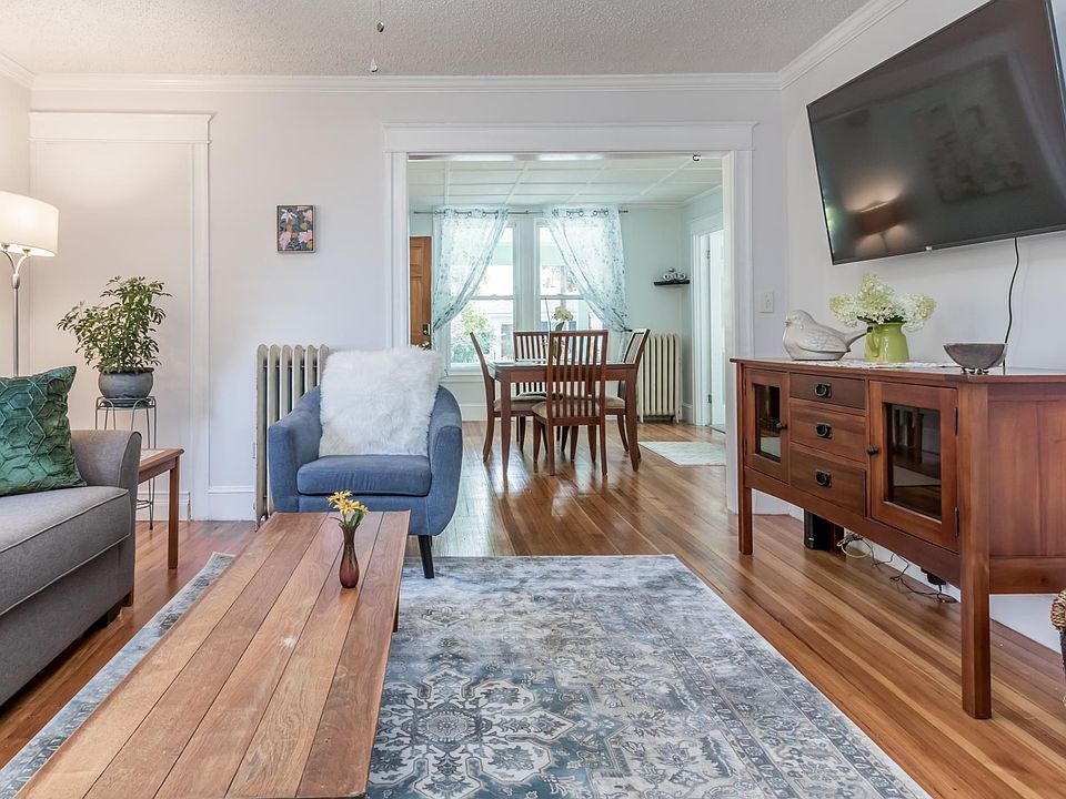 Stunning 2 bedroom with an office in Thorton Heights! This beautiful sunny unit has freshly painted walls, hardwood floors throughout, and is very clean and spacious. The large apartment offers open concept floor design with true separate living room and dining room spaces. A beautiful front porch as well as a shared landscaped back yard make this apartment all the more desirable. The neighborhood is safe and quiet yet close and convenient to Portland, Scarborough, and Cape Elixabeth. Major highways 95 and 295 are right up the street allowing easy access to commutes and travel. This rental is fully furnished! All you need to do is open the door and you're in a stunning welcoming home. Your next home! Heat and Hot Water included