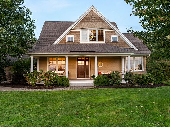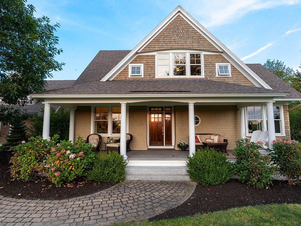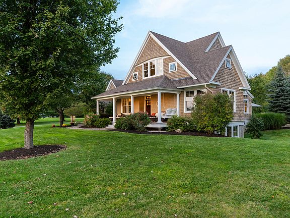 Breathtaking sunsets from the spacious covered porch are only a few of the many stunning features that will make you want to call this Granite Falls listing home. This architecturally designed shingle style home is prominently positioned on 1.4 acres of a thoughtfully landscaped lot that offers privacy with the welcoming front porch to the covered veranda/patio in the backyard. You will love the open airy design that features an eat-in kitchen with granite island and countertops, high-end appliances and plenty of storage with custom cabinetry . The red birch flooring and coffered ceilings open to the living room and formal dining. 1/2 bath, office and tastefully designed premier bedroom with private bath and walk-in closet round out the first floor. Upper level offers open space for relaxing and 2 spacious bedrooms with bath and laundry. Quiet finished office space/ bedroom suite over the garage perfect for working at home. For additional play space a finished lower level is well appointed with radiant heated floor, kitchenette, mini split unit, bedroom, media room and fitness space. Two and a half car garage opens to a mudroom with cubbies and ample space for coats and sports equipment. See attached list of extras and upgrades. Only minutes to all that Maine has to offer to include Pratt Brook Park, Wolfe's Neck State Park, Bradbury Mountain, L.L.Bean, Pineland Center for x-country skiing and pubs and restaurants in nearby Yarmouth. A 15 minute drive to Portland International Airport, premier medical center, theater and the Old Port for dining and entertainment. Just what you have been waiting for, a quintessential Maine home to suit your lifestyle for years to come. Open House Sunday from 11-1. Showings start on 9-29 . Association Fee is $!200 annually and paid quarterly.