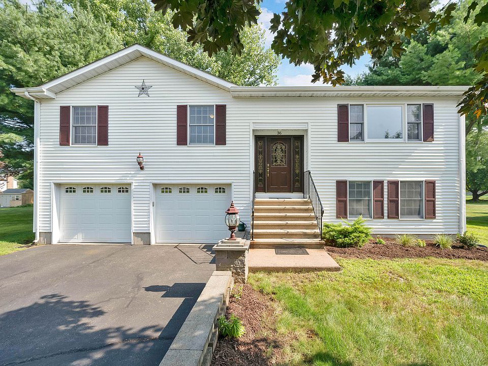 Meticulously cared for raised ranch with beautiful stone work entry nestled in a serene cul-de-sac neighborhood. Charming home features a spacious, well-appointed kitchen with granite countertops, a breakfast bar, stunning cabinetry-including some elegant glass-front cabinets and equipped with modern stainless steel appliances, making meal preparation a delight. From the dining room a deck provides indoor-outdoor living , perfect for entertaining or relaxing. Three full baths and a primary bedroom with two sets of closets and its own full bath, this home is so easy to live and entertain in! Huge lower level rec room adds so much living space with it's own full bath and walkout sliders to a fabulous backyard! The large, flat backyard features a large shed and irrigation system, ideal for maintaining a lush, green space. Central air conditioning ensures year-round comfort. Conveniently located near retail shops, restaurants, highways, and a public golf course, this home giv both tranquility and accessibility. It's a great walking neighborhood for leisurely strolls. Originally owned and lovingly maintained, this home is ready for you to move in and make it your own.