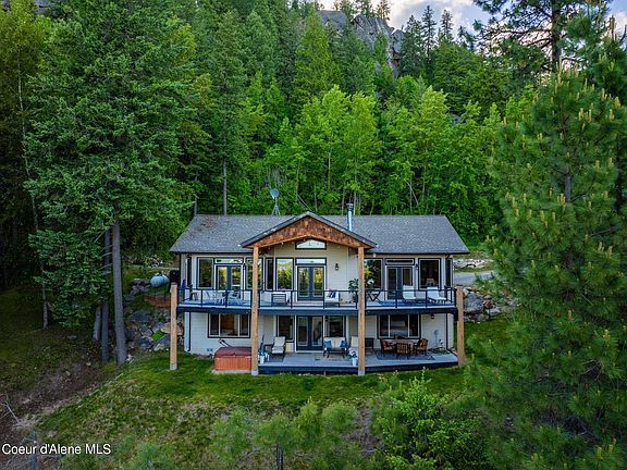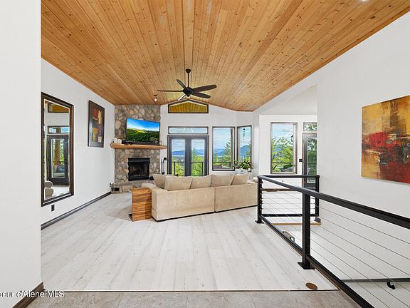 Welcome to this exceptional home where modern elegance blends seamlessly with the beauty of North Idaho. Designed for both comfort and style, this residence features soaring vaulted T&G ceilings and a breathtaking wall of windows that frame stunning views of Lake Pend Oreille and the Sandpoint skyline. The heart of the home is a chef's kitchen, boasting premium appliances, including a Thermador wall oven, a 36-inch Viking stove, and bold black granite countertops.The main-level master suite offers a spa-like bath with a 9x4 walk-in shower, dual rainfall showerheads, and a heated towel rack. A floor-to-ceiling rock fireplace anchors the living room, while the expansive 55x12 deck invites you to soak in the views. Downstairs, a second living area, three bedrooms, and an updated bath provide space for guests. The lower deck features a hot tub for ultimate relaxation. Just 10 minutes from Schweitzer Mountain Resort, and well maintained roads for easy year-round access.