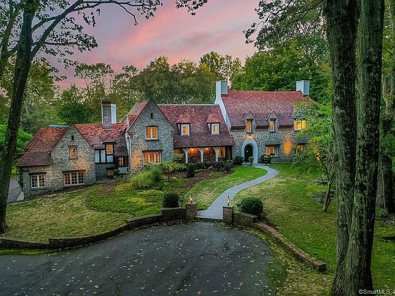 "Stone Gables," sitting on one of the most prestigious private roads in the heart of Westport, is an elegant estate located at the end of a cul-de-sac on Green Acre Lane. Bordering the Caryl & Edna Haskins Nature Preserve, this 1930s stone & brick country manor, situated on 2.23 acres is a rare & remarkable find. The location is one of the most architecturally significant neighborhoods in town. The home is replete with extensive interior & exterior details including terra cotta tiled roofing of the highest quality and caliber. Entrance includes a foyer with French limestone floors & grand oak staircase, & two walk-in closets. Three steps down from the foyer is the stunning Great room with stucco walls & stone fireplace flanked elegantly by arched French doors opening to the side blue-stone terrace. French doors lead to the spacious back terrace with a trellis & beautiful property views. Dining room also exhibits French limestone floors & kitchen addition boasts an impressive limestone fireplace mantle with patterned stone & oak floor. All of these rooms lead to back terraces & artfully designed gardens. Off the kitchen sits an inviting family room while the lower level features a home gym & bonus room. There is a bedroom guest suite on the main level & on the second level there is a private master suite which includes a sauna along with three additional bedrooms, one ensuite & the others with a shared bath. An ideal home for comfortable living & elegant entertaining