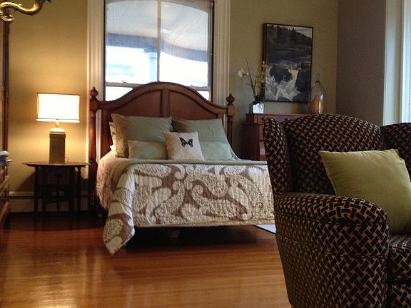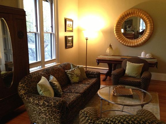 Absolutely stunning rehabilitated Victorian suite, with giant bay window facing sunset, ten foot ceilings, working fireplace, quarter-sawn oak parquet floors, coffered ceiling, and crystal chandeliers. Park-like grounds boast eight fruit bearing trees, serpentine flat stone walls that are works of art unto themselves, and a koi pond with waterfall. Yup, you are still in the city, with a five minute walk to the Orange Line in one direction, or the 39 Bus in the other. Quick bike ride on bike paths to Brookline, downtown Boston, Kendall Square, Newton. Walk to Whole Foods, Happy Market, banks, post office, award-winning bookstore, excellent restaurants all of which prepare take-out. Beautiful big tile bath with two person jacuzzi (in addition to shower). Kitchen is simple, hotel-style efficiency, with under counter refrigerator, microwave, cutting surface and induction cook-top, but no oven. $1780 includes everything, even laundry and high speed internet. One person only -- not a couple. About pets: one small dog will be considered.