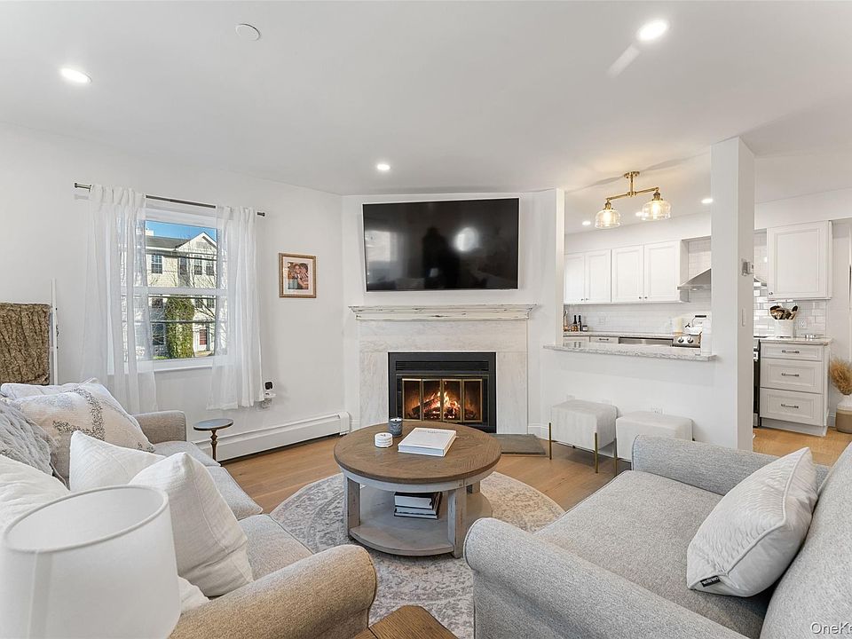 Step inside to a bright, open-concept main level featuring fresh paint, recessed lighting, brand-new flooring with updated baseboard trim, and new windows including a new sliding door that leads to a charming private balcony. The stunning, fully renovated kitchen showcases all-new Samsung smart appliances, new cabinets, quartz countertops, and a classic subway tile backsplash. The living area is anchored by a stylish fireplace wrapped in Bianco Rhino marble, adding a touch of sophistication. A beautifully updated powder room completes the first level.