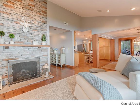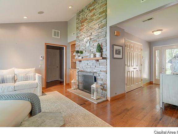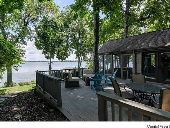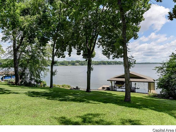Who wouldn't want a main body lake home with a deep water dock & view that's about a mile long over Lake Springfield & only a few steps from Island Bay Yacht Club? Remodeled with vaulted ceilings, stone fireplace, maple cabinets, screened porch, fire pit, seawall, zoned heat & a/c, plus a heated garage and bath floors too and an electric boat lift/house. Roof for house, boat house, & guest house in '12. Yes, there is an efficiency style guest house with it's own bath. There is a brick driveway too.Total SF includes guest house.
