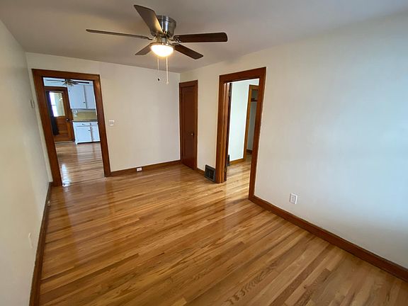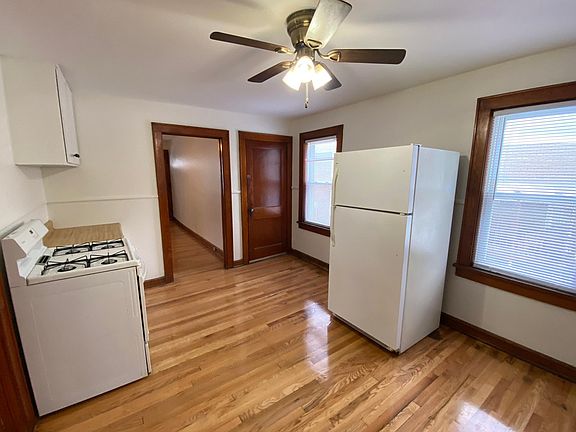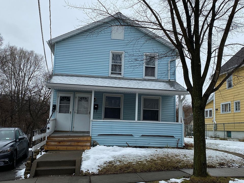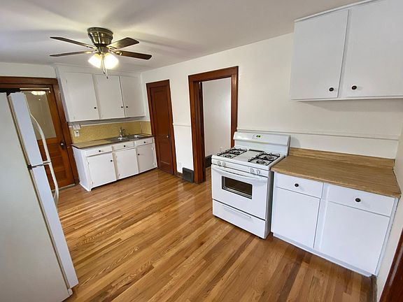 Newly updated large 2 bedroom 1 bath 1st floor unit with beautiful newly refinished hardwood floors! Good sized bedrooms with large closets and a large eat in kitchen. Enclosed back porch and covered front porch. Bright and clean unit. Laundry on site. Shared basement access. Smoke and pet free. 1 year lease then turns to month to month after 1st year