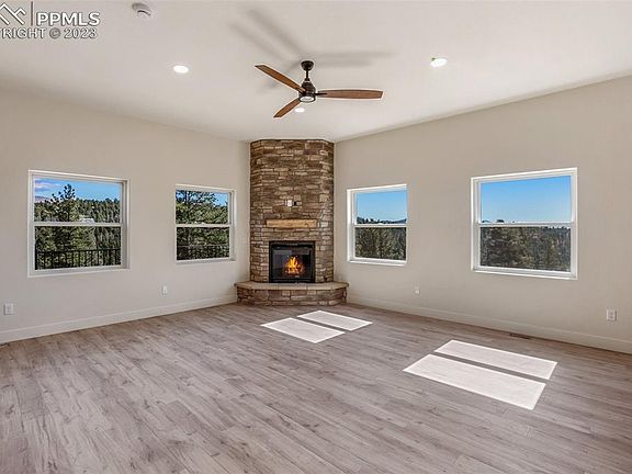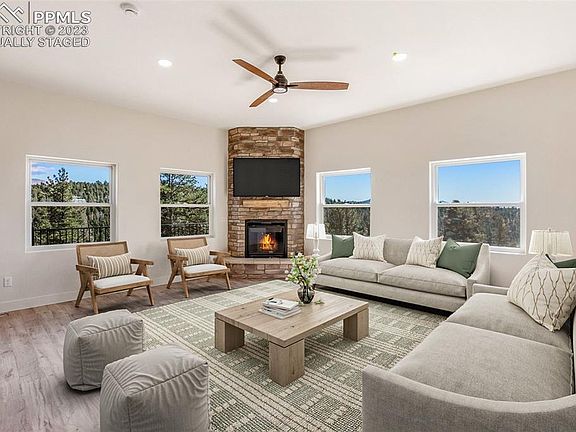 This custom stucco & stone clad mountain home, with the robust timber post entry & custom solid wood double doors provides a perfect introduction to what is inside! From the garage the owner accesses the home through an ample mudroom. This MOUNTAIN RETREAT boasts custom features & upgrades throughout topped off by a stunning view off the back of Pikes Peak. The main level has 10 ft. ceilings throughout. The great room features large windows providing maximum mountain views & a corner stone clad gas fireplace. The back door leads to a composite deck from which mountain views can be enjoyed to the east as the sun rises over America’s Mountain. The kitchen off the great room abounds in custom features including Fabuwood cabinets topped off with custom granite countertops & a tile backsplash. The stainless-steel appliances, pantry & large island provide an efficient workspace. The main level living also includes a Master Bedroom suite with a walk-in closet and bathroom that includes both a large custom walk-in shower & a soaker tub. The open staircase leads to a walkout basement that is equally impressive. This expansive space does not feel like a basement with its 9-foot ceilings. The lower-level family room boasts a window wall providing plenty of light. The two bedrooms are spacious & share a full bath with a double vanity. Finishing off the basement is a separate office space & laundry room. Enter the home from the two-car garage to a spacious mud room with plenty of room for coats/shoes & a bench. There are expansive Pikes Peak & rock formation views from the east facing windows & the Sangre DeCristo views from the south side! This home has been built to endure mountain conditions with 96% efficient Armstrong furnace, Anderson windows and a roof clad with Owens Corning Duration shingles. R38 insulation in the ceilings & R-19 in the walls provide ultimate protection from the mountain elements. The house is perfectly nestled on this .59 acre lot. It’s just Beautiful!