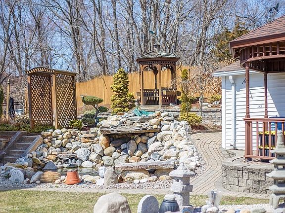 This home is an incredible oasis, found at the end of a dead end street! The fully fenced yard is a gardeners dream complete with 2 gazebos, greenhouse, beautiful perennial gardens and hardscapes, koi lond with waterfall, and a goldfish pond with a bridge. The sound of water will instatly put you in a state of peace, sitting in your serene, lush and amazing yard. The home features 3-4 bedrooms, 1.5 baths, 1st floor laundry, kitchen pantry closet, and a fabulous side porch that will enable you to enjoy the yard for a full 3 seasons. There is also a small mudroom coming in from the back yard, perfect for stashing work boots and gloves after an afternoon in the yard or greenhouse. The possible 4th bedroom is staged as a dining room. The basement is quite unusual with steel beams and over 10 foot ceiling height in the main basement area, with another upper section for additional storage. The garage will keep your vehicle out of the elements as well as a space to keep your gardening tools.