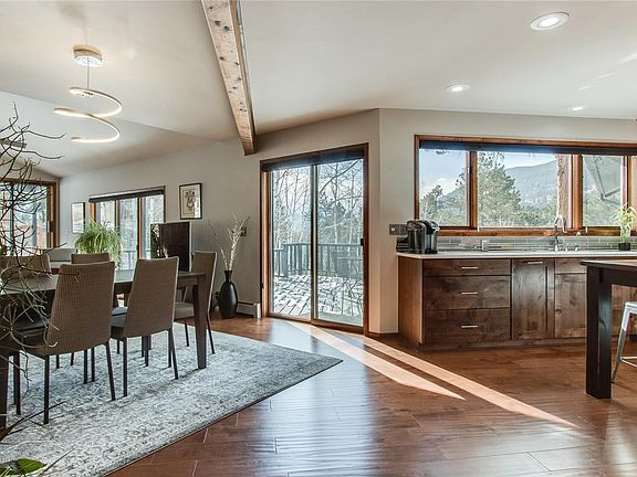 Wake up every day to the sun kissed alpenglow on Mt. Evans, then relax in the evening basking in the sunset that falls behind this majestic snowcap mountain. Captured from almost every window, the view is awe inspiring. This home has been remodeled throughout and exudes a high-level of sophistication and refinement while also comfortable, inviting and warm. The kitchen was completely renovated and features custom made knotty alder cabinets, custom black walnut island, stainless steel appliances and quartz countertops. The custom designed master bathroom has a rain shower head, soaking tub, warranted diamond seal shower doors, custom made mirrors and glass countertop and heated tile floors. The tranquil corner lot has a park like setting and is nestled amongst an aspen grove with plenty of room for the pets to roam freely in the fenced dog run. If you've imagined yourself living in the mountains with a snowcap mountain view then this is the Colorado home you've been dreaming about.