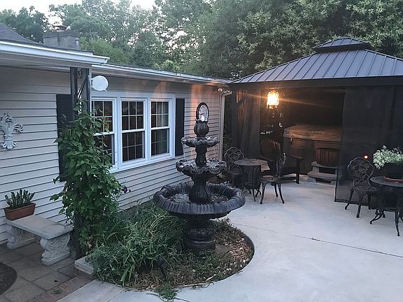 Remodeled and well maintained ranch home on large corner lot. 3 bedrooms, 2 full size remodeled baths, remodeled kitchen. Master bedroom has en suite with access to hall and 2 closets, one is walk-in. Separate laundry room with several cabinets and bar plus upright freezer and pedestal washer and gas dryer. Larder/canning room with large nice shelves and chest freezer and office desk space. Central air and Natural gas heat, gas fireplace, 5 burner gas range/stove, outdoor natural gas grill hookup and outdoor natural gas fireplace/BBQ. Covered front porch with new wood railing with solar light posts and new dual ceiling fans and lights. Plaster walls and smooth ceilings. Refinished Hardwood floors. New appliances, gourmet 5 burner stove with convection oven, fridge with 2 ice makers and bottom freezer drawer, garbage disposal, under cabinet lighting, kitchen 2 seater bar and a 3 seater bar plus bistro seating in large living room. Elegant new front door and side light. Freshly painted interior. Newer roof, hot water heater and HVAC. New thermal pane windows throughout. Large dining room that seats 12. New lighting fixtures and fans throughout. Granite countertops throughout. Built-in Hall tree. Attic storage with drop down ladder. Utility room with outdoor entrance for gas water heater. Detached 2 car garage with workshop, plus carport and a boat/RV carport. Ample parking on long driveway. Nice landscaping blooming throughout the seasons, vegetable garden space and raised beds. Berry bushes and fruit trees. Steel 14’x12’ gazebo on back patio with hot tub spa. Small wall fountain and one Large 3 tier fountain. Nice quiet wooded neighborhood. City trash pickup.