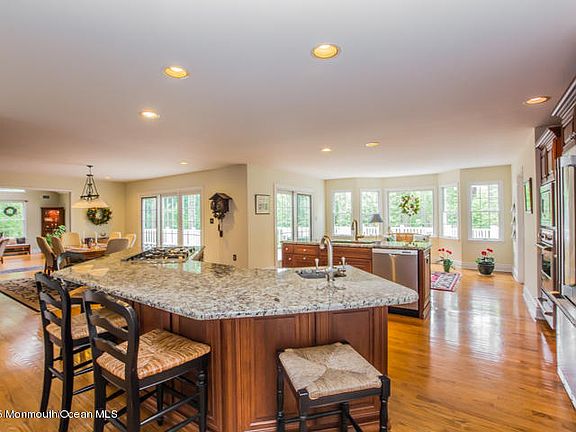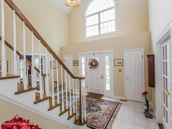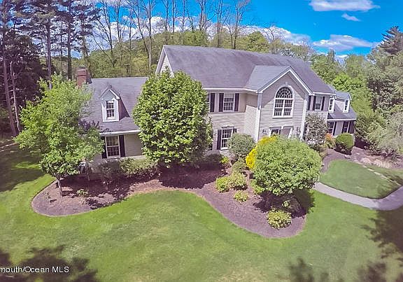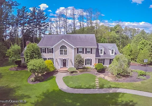 Southern Charm tucked away on 1.3 acres of private cul-de-sac in prestigious Colts Neck. The grand 2-story foyer is flanked by luxurious formal dining and formal parlor rooms both w/ decorative mouldings. Gleaming wood floors continue as you step down into your Great Room w/ vaulted ceilings, 2-story fireplace & deck access. Your massive new custom kitchen w/ sitting room and expansive breakfast nook are centrally located to provide open flow for entertaining. 1st floor study/BR w/ full bath provide flexibility. Up the split Cinderella staircase are 3 spacious guest bedrooms PLUS a remarkable vaulted Master Suite w/ new marble/granite bathroom, walk-in closets & unfinished bonus room. A 50x25 TREX deck spans the back of the home overlooking green acres. Don't forget the walkout basement!
