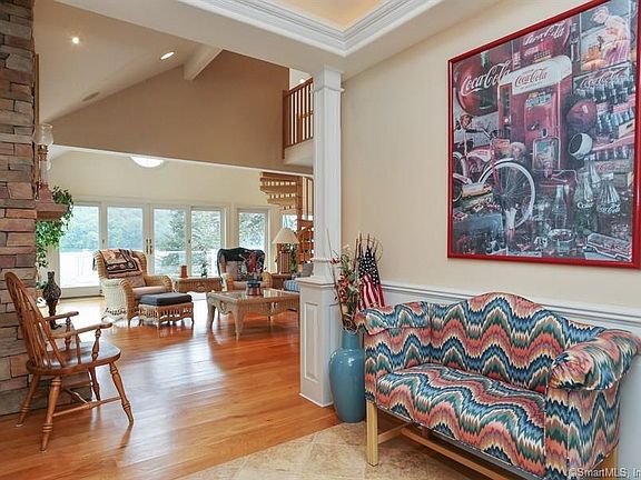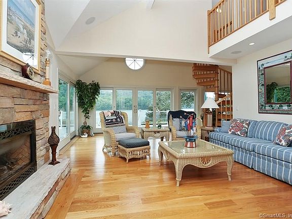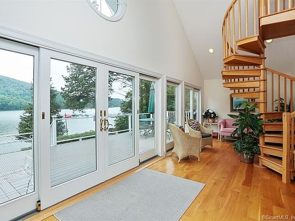 Candlewood Lake Community: Private Boat Launch, Dock, Direct Water Front Lake Club Living, with Panoramic views and privacy. Spectacular sunsets, Custom designed waterfront contemporary, with an open floor plan. Large Kitchen with soaring ceilings and large windows, Vaulted ceiling in bedroom, Large Deck, and stone paver patio, Recent up-dates include: Roof, Windows, siding, electric, Kitchen, Bathroom, Appliances, Heating, Deck, Patio, outdoor lightning, Garage Door, A/C. Garage has finished storage Loft. Professionally Landscaped, with stone walls and plantings. Totally renovated in 2008. Enjoy swimming and miles of Hiking Trails, Clubhouse with social events and activities. Easy commute to New York City. House can also be sold furnished. One time association fee for new owners of $5,000 Jet Ski ramp and Boat Lift not included.