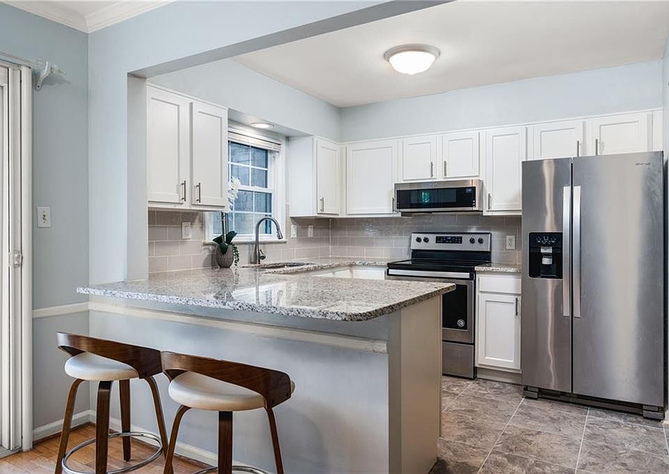 - Features: Breakfast Bar, Cabinets White, Eat-in Kitchen, Solid Surface Counters, Stone Counters