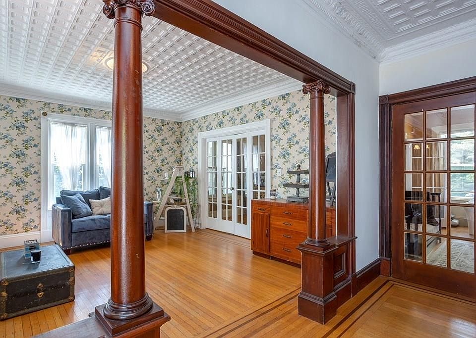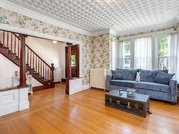 This beautiful home is just a pleasant walk to town full of great restaurants, activities, shopping & more! This spacious antique colonial opens to a beautiful foyer, stylish wood columns lead into the living room that is full of character, gorgeous tin ceilings, large windows, double french doors that lead into an open dining room. The dining room boasts two sets of french doors, a stylish stained glass window, decorative molding, beamed ceiling & a custom built-in cabinet, lovely! The galley kitchen is simple & full of light. The beamed ceilings in the open family room extends to the outdoor covered front porch which is cozy & shaded. A walkthrough full bathroom opens to the sunny den with a slider that opens to a flat backyard. The den is filled with light, bead board & decorative ceilings. The first floor bedroom can be used as an office or home gym & has two sets of french doors. The upstairs offers a large master bedroom, jack & jill bathroom & two more bedrooms. A must see!
