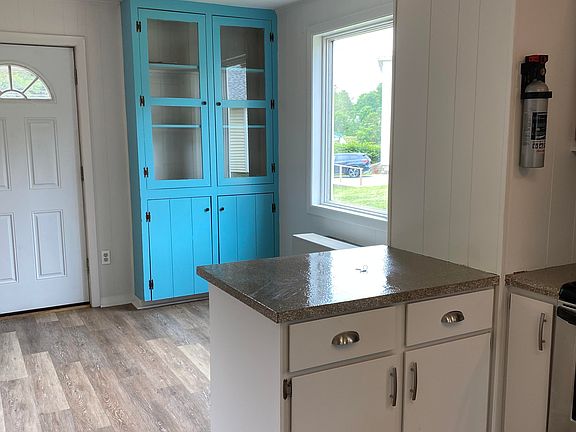 Stylish blue built-in hutchNatural lightPlenty of cabinet spaceUpdated kitchenModern vanity and fixturesEfficient layoutBeautiful wood-style flooring