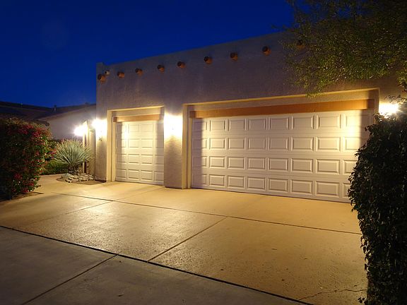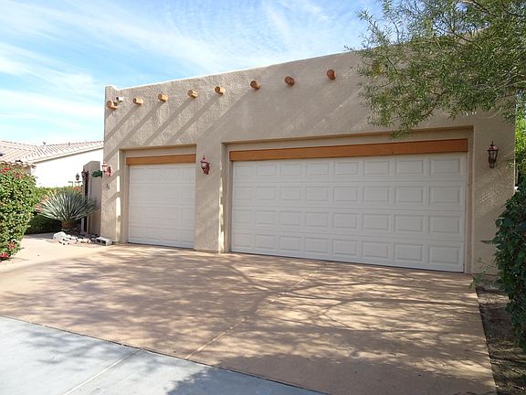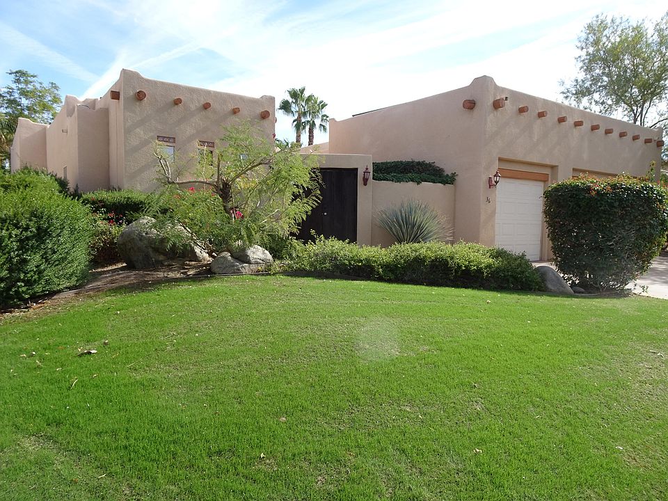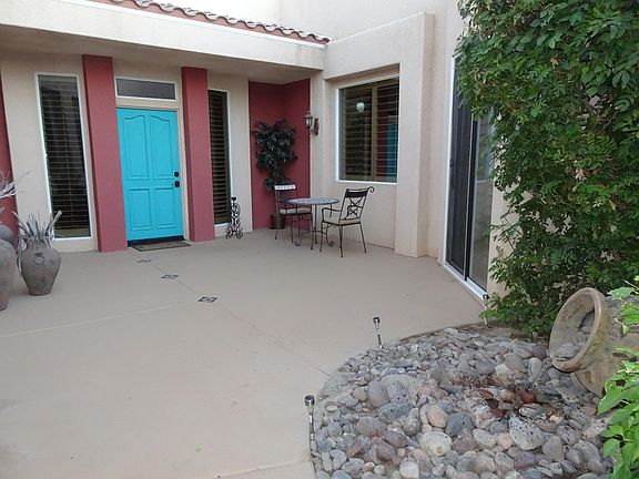 This Sante Fe Style Home's location is perfect, perfect, perfect! Walking distance to tennis gardens and just minutes to everything you need from small and big box shopping to fine dining and entertainment. Enter through rustic wood gates into a secluded court yard with talavera paver accents and soothing fountain. The front door opens to a spacious formal dining room with view of the patio. Beyond is the heated pebble tech salt water pool and a stand-alone fire pit to take the chill off desert nights while toasting s'mores. The impressive Jenn-Air BBQ is included too. The great room/kitchen features a cozy Kiva fireplace, kitchen Island, stone tile backsplash and all stainless appliances and a super quiet disposal. Behind the kitchen is a den with wood tile floor or repurpose as a dining room. Add a door to make a living room for the attached private entry en-suite casita? Everything about the master suite is huge: Huge bedroom, huge walk in closet and huge bathroom with dual vanities. The full hall bath has been remodeled with antiqued stand-alone sink. Tile flooring throughout out and carpet in the bedrooms. (New in the casita and one guest bedroom.) Plantation shutters through-out. AC's are just 5 years old plus there's a rarely used evaporative cooler. The spacious 3 car garage has super quiet openers. Fruit trees galore! Wired for sound and FIOS ready too! Sold luxuriously furnished per inventory this one won't last! Call now for a private showing!