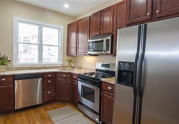 Stunning 3 bed 2 bath floor through apartment in condominium building with 1 parking space included. Central Air & Heat, Washer & Dryer in Unit! This apartment has gleaming hardwood floors and recessed lighting. Large living room with bow front windows and warm fireplace. 3 Equal Sized bedrooms with closet space and bright windows. Modern kitchen with granite counter tops, cherry cabinets, and stainless steel appliances. Spacious deck in the rare and one private parking space in the parking lot tenant responsible for all utilities..Parking included in the lease