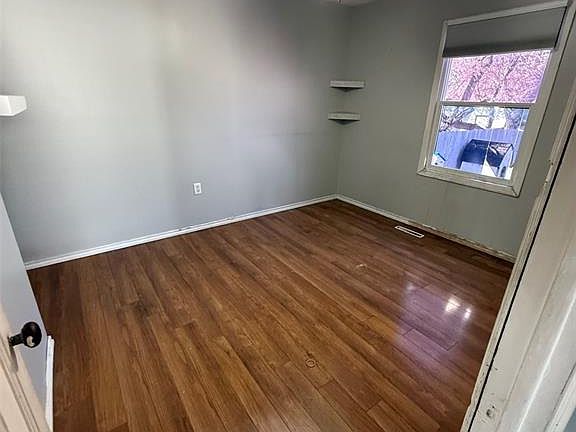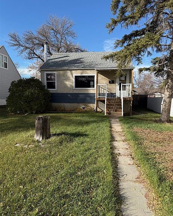 Welcome to a bright, bungalow-style starter or investment opportunity. The exterior offers a sunny lawn, and mature trees for shade. Inside, the front living room is filled with natural light and features laminate flooring. The adjacent galley kitchen provides plenty of cabinet storage, subway-tile backsplash, and white appliances, with space at the end for a small dining nook. Bedrooms are comfortably sized (see photos) with laminate flooring and a ceiling fan in one room. The lower level is unfinished—great for storage, hobbies, or future development to your taste. Out back, a deep, fenced yard with large trees sets the stage for play, pets, and gardening, and there’s a detached building/garage as pictured plus off-alley access. This home delivers strong bones, a generous lot, and solid potential at an attainable price.