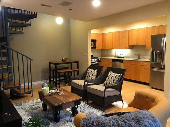 Fully furnished 2-story luxury loft-style Townhome in a complex of sixteen sophisticated units designed by celebrated local architect, J. Robert Hillier. Combining modern and industrial elements such as exposed brick, recessed and track lighting, built-in stereo speakers, a spiral staircase and high ceilings, light-hued bamboo floor, the skylights and a wall of windows looking out upon the beautifully landscaped courtyard with bench seating create a light and bright feel to the living areas.
