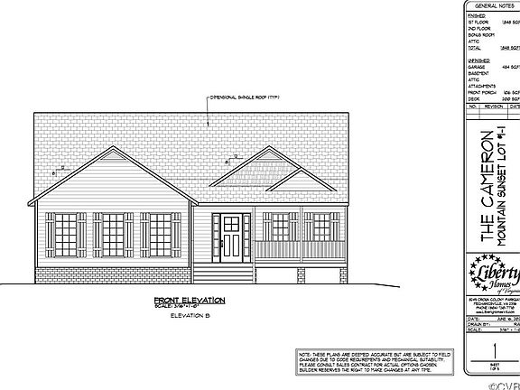 ROUGH INS UNDER WAY! (2/5) The NEW CAMERON one level floor plan, located at Mountain Sunset in Louisa. Upgrades include a welcoming front porch, sideload garage with opener, vaulted ceiling in the great room and kitchen, tray ceiling in the master bedroom, shake siding in one section, craftsman style front door and shutters, pull down attic stairs with storage, 10x20 rear deck, fireplace option 3, stainless steel appliances, 2x7 Island, Tier 2 cabinets, 36" wall cabinets with crown molding, Oversized window over stainless steel farmhouse kitchen sink, 2 pendant lights over island, granite countertops including island with overhang, Rockport interior doors, Laminate flooring throughout main living areas, 5' ceramic tile shower and flooring in the primary bath, 2 extra LED lights in the great room, boxes trim package in the primary bedroom, mudroom trim package, adult height toilet in the primary bath, LED lights in all bedrooms, and City Loft paint (walls and ceilings). Summer completion! Ask how you can receive up to $10,000 in closing cost assistance. SUMMER COMPLETION!