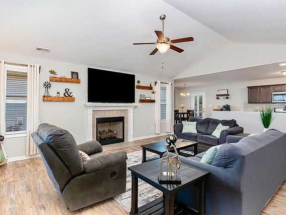 This is a fantastic ranch in the River Oaks subdivision with a rocking chair front porch! The large family room with fireplace and gas logs is open to the kitchen, offering granite countertops, tile backsplash, SS appliances, breakfast Room & walk-in pantry. The spacious master suite with tray ceiling, and a walk-in closet, adjoins the ensuite featuring dual vanity, garden tub, and shower. The 2 additional spacious bedrooms share a full bathroom. Custom features in the laundry room. The covered screened-in porch in the back is great for entertaining, The fenced-in backyard will keep your family and pets safe. This home qualifies for 100% financing w/ USDA! Exercise equipment in the garage will not stay. Close to shopping and I-40.
