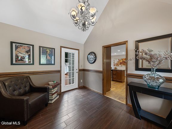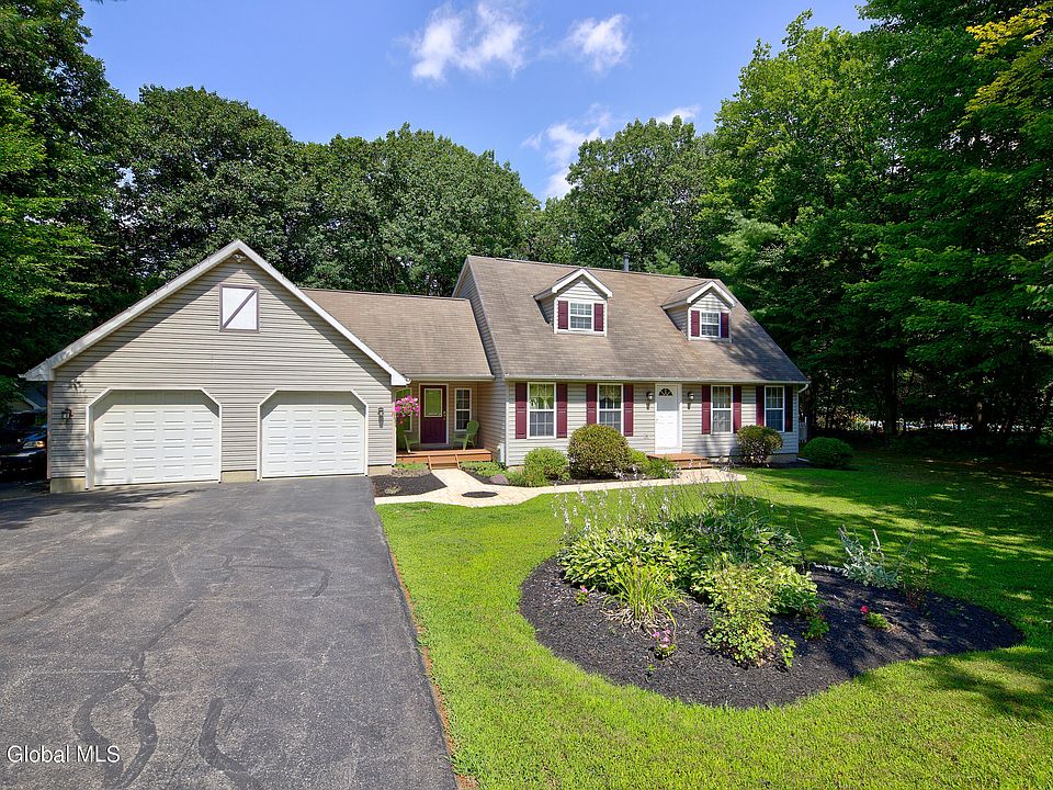 This charming, expanded cape features updates galore, including: open kitchen concept w/ S.S. appliances, solid surface counter tops, island w/ seating for 4, hardwoods w/ radiant heat that are also found in the bright and welcoming breezeway. First floor also features an expansive living room & full bath. Gracious primary bedroom featuring modern en suite BR & w/tiled shower, along w/ 2 other bedrooms and third full bath on 2nd floor. Full dry basement offers plenty of storage. Large back deck overlooks the beautiful 18' x 36' inground pool, perfect for entertaining! Attached oversized 2 car garage. Fenced in backyard all situated in a desirable cul-de-sac neighborhood 20 minutes to Clifton Park, Malta, & Troy, 30 mins to Saratoga or Albany.