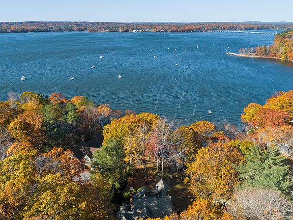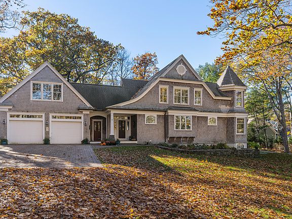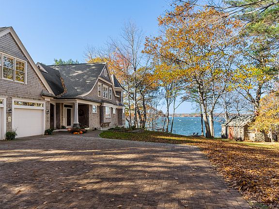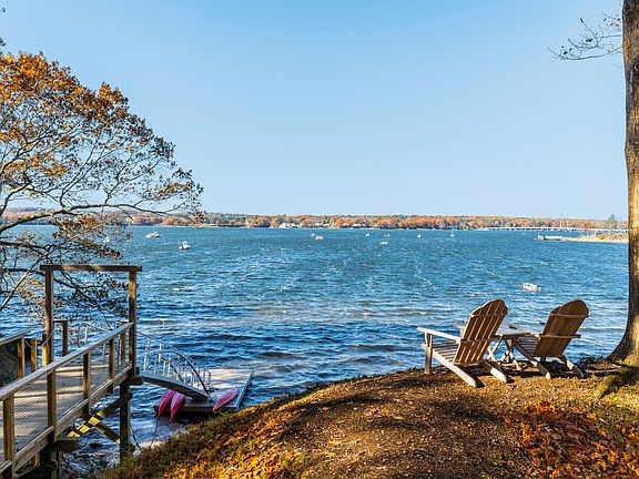 Gorgeous shingle-waterfront home with stunning sunset views! Exquisite craftsmanship throughout; stone fireplace with cathedral ceiling, gourmet kitchen and pantry, first floor primary bedroom suite, luxurious office suite with gas stove and builtins, 4 bedrooms or 3 bedrooms & an office -3 bedroom septic. The setting is complete with extensive hardscape details, lovely landscaping and a private tidal dock. Views of the shared association beach and deep water dock are also enjoyed from the bank of the property. Nearby are trails, sidewalks and the community center. A wonderful property in a fabulous community!