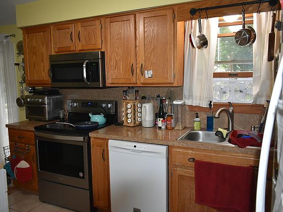 Spacious 4 bdrm/2 bth home with open floor plan features vaulted ceilings, hardwood & tile floors, breakfast bar, combined kitchen/dining room/living room area, a small pantry, and sliding glass door on to the back deck. The Master Bdrm includes 2 double closets. There is a lg yard with an additional (wooded) lot, a paved driveway and 1 car garage (in the basement). The lower level features family room and you will enjoy spending warm & cozy winter evenings with the fireplace/wood stove. The 4th bdrm is located in the above grade basement and includes a double closet.
