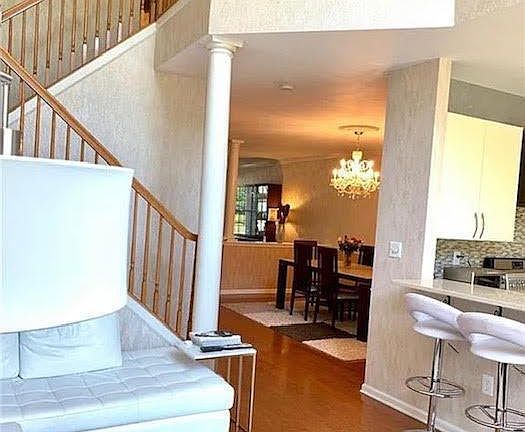 Beautiful, Bright, & Fully Renovated 3Bdrm/2.5Bath Townhouse w/One Car Garage, Fenced Patio, & Minutes Away from NYC Buses & All Amenities. Home Features: Beautiful Curb Appeal, Living Rm, Formal Dining Rm, Two Story Family Rm w/Large Palladium Window & Duel Gas Burning Fireplace Connected to Spacious Newer Eat-in Kitchen w/Heated Floors, All Stainless Steel Appliances, Quarts Counter Top, Mosaic Backsplash, Powder Room. Upstairs: 3bdrms, 2Full Bath, Laundry Room, Hardwood Floors Throughout the House, Designer Wall Paper. NO PETS. A Rare opportunity to rent this type of home.