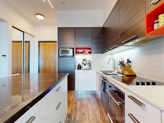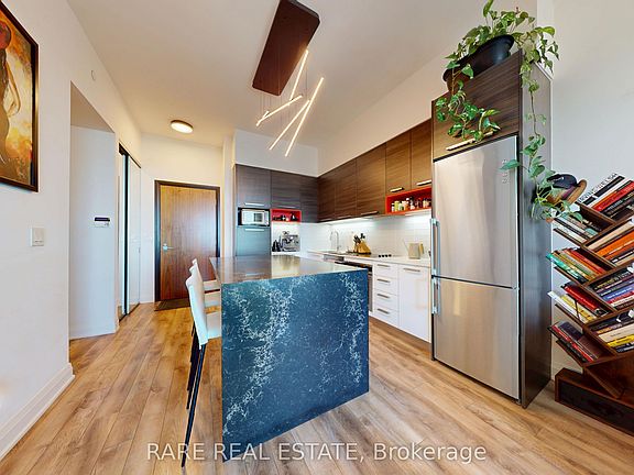 Welcome to 2102 at 36 Park Lawn Rd, Where Style Meets Sophistication. This stunning 1-bedroom + den, 1-bath suite offers refined urban living with rare 10-foot ceilings and breathtaking lake views. The open-concept kitchen features a luxurious custom waterfall island with built-in storage, complemented by new modern light fixtures that add warmth and elegance throughout. The spacious bedroom includes a custom closet storage system, while the versatile den offers the perfect space for a home office or guest area. Enjoy relaxing in the bright living room, a TV and media unit can be included for your convenience. Located in one of Etobicoke's most sought-after communities, this unit combines design, comfort, and functionality. Parking may be excluded for a $75 discount.