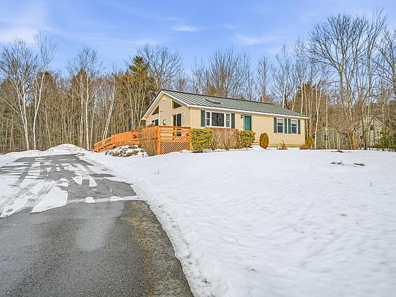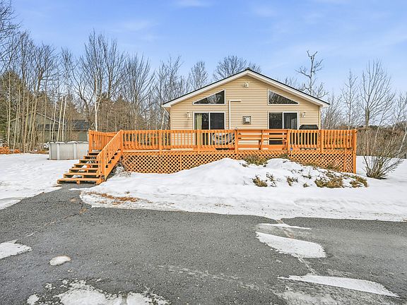 KING OF THE HILL. What a fun house to live in. This sun drenched modern ranch sits on 3.41 acres on a quiet dead-end street. Full southern exposure with lots of glass. The inside is spectacular and features open concept living. Cathedral oak kitchen with stainless appliances, large center island, skylight and door to massive 392 s.f. wrap around deck and above ground pool. Cathedral dining area, spacious cathedral living room with stone fireplace and gas insert, skylights, glass galore. There are 2 bedrooms, one of which is a master suite with walk-in closet custom tiled walk-in shower. The second bedroom is decent size and the second bathroom is oversized and has a washer/dryer. The basement features a newer on demand water heater and still has the hot water propane boiler which is not connected. Lots of special features include: whole house generator, seamless metal roof, 2 heat pumps for efficient heat and a/c, wrap around deck, 14' around above ground pool with new pump in 2025. Although the road is private and paved, the city of Augusta does plow it. This home is the last house in on a nice cul-de-sac. What a great place to call home.