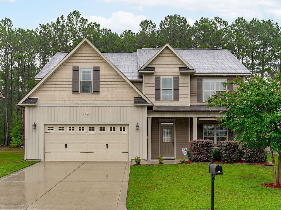 PRICE IMPROVEMENT! This charming, spacious farmhouse style home welcomes you in from the covered front porch to an entry with a large, vaulted ceiling and gleaming laminate floors that compliment the freshly painted walls. The formal dining room offers a tray ceiling with crown molding, and a pass through with a large pantry that connects to the open kitchen. Also accessible from the entry is a mudroom complete with an organization station just across from the garage entrance. Once in the kitchen, the center of this home shines with stainless steel appliances, an oversized center island with breakfast bar seating for 4, crown molding topped cabinetry, tile backsplash, granite countertops, recessed lights and hanging pendant lights over the bar for enhanced task lighting and ambiance. The family room boasts many luxury touches including a coffered ceiling, large bank of windows with views to the patio and backyard, new carpet, and fresh paint. The polished tile as well as crown molded mantle detail surrounding the gas log fireplace make this a cozy place to relax or entertain. It is sized nicely to accommodate a variety of seating arrangements and styles to suit your aesthetic. The downstairs owner's suite is tucked away at the back corner of the home for a private sanctuary. Complete with tray ceiling, ceiling fan, many windows, new carpet and fresh paint, this oasis also boasts an ensuite with a large walk-in-closet, private water closet, garden style soaking tub, step in shower with glass enclosure, and dual sink vanity. Upstairs, there is a loft area at the top of steps perfect for a reading nook or study station. Also, four bedrooms, bonus room, laundry room, and two full baths complete this space. Enhancements include a frosted, custom door for the laundry room, as well as a folding and hanging station for convenience. The bonus room is well laid out to accommodate a variety of uses including a game room, home office, or as a 5th bedroom. The two full baths upstairs means less fighting over sink space. Out back, the paved patio is generously sized to accommodate a grill, fire table, or a variety of seating arrangements for more outside living and entertaining space within your own private, park-like setting, thanks to the wood fence, tall trees, and grassy backyard. This home in Cameron Woods is situated just 5 miles south of Sanford, 5 miles from Carolina Lakes, 20 miles west of Lillington, and less than 25 miles north of Fort Liberty making it the perfect location for commuting and accessing shopping, dining, and recreational activities.