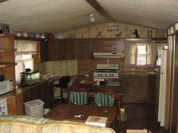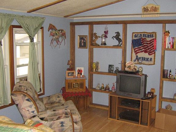 Move into this mobile with covered porch and awnings. Open living room and kitchen with vinyl wood look floors throughout dining room and bedrooms. Newer thermal vinyl windows, central air. All appliances and propane tanks included. 55 and up community accepts pets to 30 lbs. Lot rent $370 includes sewer and trash.