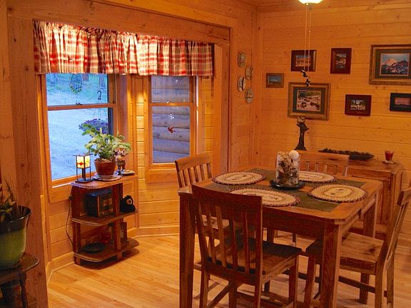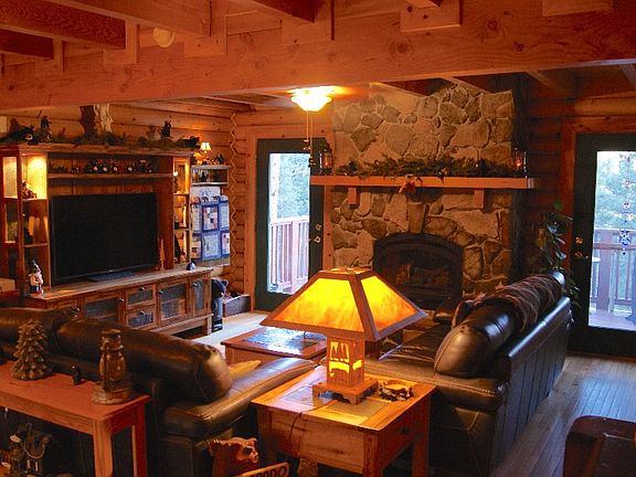 Beautiful log home on 1+ Ac with Pikes Peak views; living room with gas fireplace; spacious kitchen with all appliances included; main level Master Suite with jetted tub and separate shower; convenient laundry on main level; tongue & groove wood ceilings; dining room with bay window; upper level has two more bedrooms and full bath; walk-out lower level to large fenced back yard; spacious family room; large front covered deck with porch swing; back deck faces Pikes Peak; great for BBQ; common area with pond; privacy at its best!