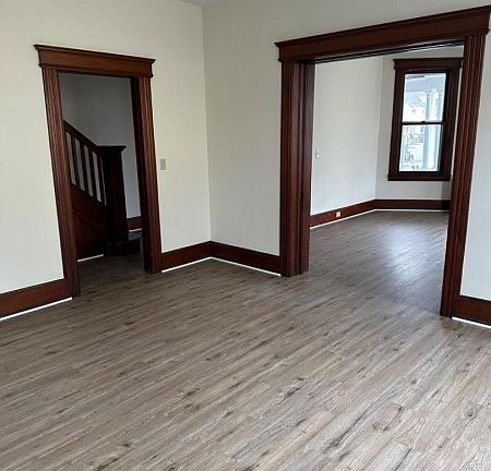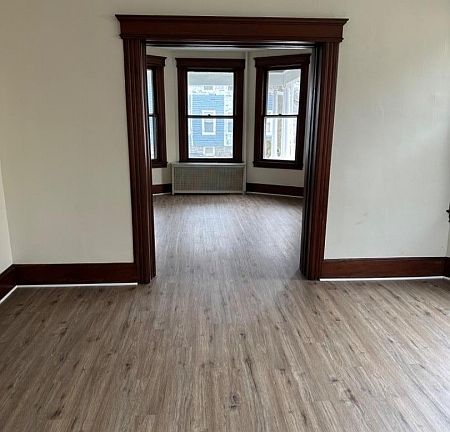 Well maintained 3 bedroom 1 bath Duplex . Beautiful woodwork throughout the unit. Newer Flooring, High ceiling and big windows give a bright and airy feeling. Large rooms. Walk up attic for storage. Laundry room in basement. Close to major roads and shopping.