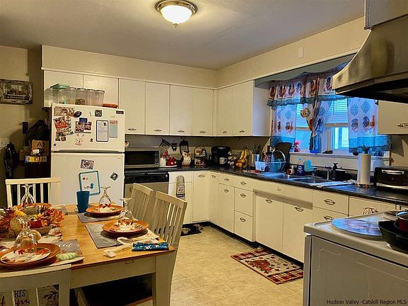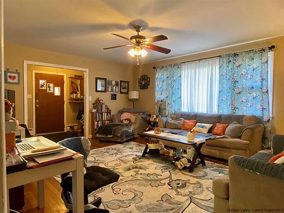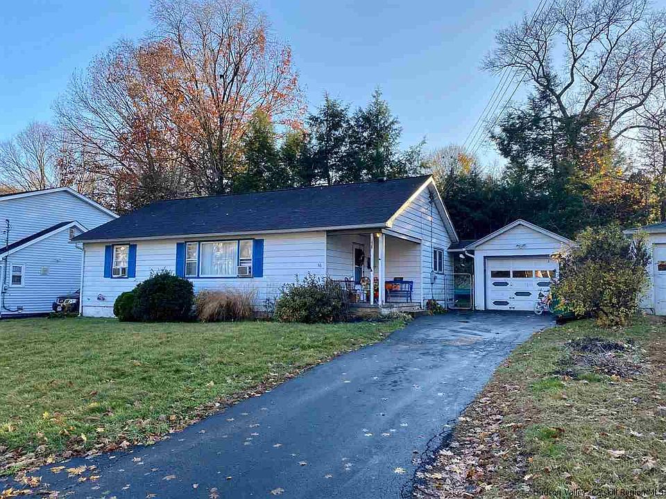 Sturdy 1950's ranch in desirable neighborhood setting. Original oak hardwood floors throughout, this 3 bed, 1 bath home includes a large eat-in kitchen, 1 car garage w/ room for a workshop, 3 season enclosed porch and blacktop driveway. Lovely back yard is fully fenced with mountain view. Improvements include double pane replacement windows, upgraded electric service and boiler. Fully finished basement has a dry bar and bilco-type walk out to back yard. Walking distance to the bus, local restaurants, theater, school and ball fields. Short drive to Sam's Point, Catskill and Minnewaska state parks.