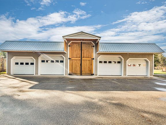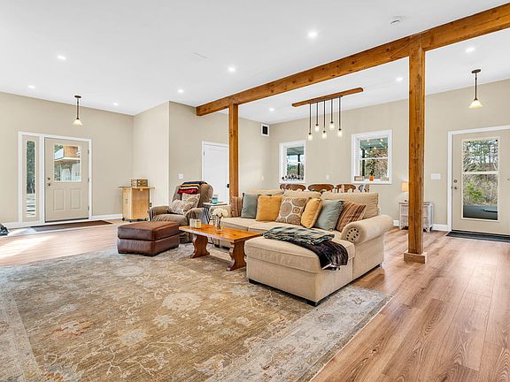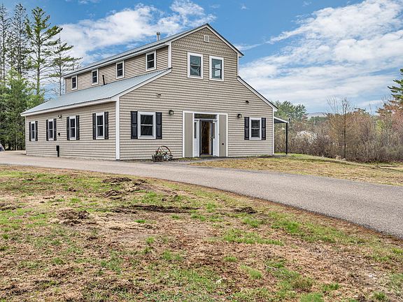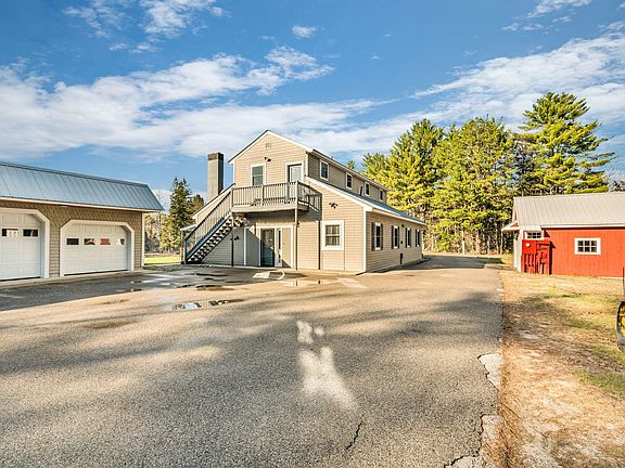 This two-three bedroom, two bath country-style home offers inspiring spaces and remarkable outdoor space. Some key features include steel roofs, radiant heat, vaulted ceilings, exposed beams, and a new updated open-concept living area. Paved driveway leads to large detached 5-bay garage offering abundant space for all your motor vehicles and tools— with the center bay large enough for an RV or other large vehicle. If that isn't enough space, the property also has a carriage house, which was previously used as a gym, but could do well as a yoga or art studio. A wood drying kiln shed sits on site for ease of use for either of the two wood stoves in the open-concept living/dining space, or upstairs lounge. The property offers all of this on a private 5-acre riverfront setting overlooking the Shepards River. The big lawn is dabbled with flower and vegetable gardens, ornamental trees, lots of wildlife, and a fire pit to admire it all from. It adds open rolling fields, a private brook full of frogs and freshwater creatures, and a private swimming hole on the river for a refreshing summer dip. The location has easy access to snowmobile trails, mountains, rivers and lakes, hiking and biking trails, and ski mountains nearby for winter sports. 15 minutes from Conway, NH and Fryeburg, ME; Only an hour to Portland ME and the seacoast. The local MSAD 72 district includes distinguished Fryeburg Academy, and other great schools. With mix of nature and function, the beauty of this estate shines through both inside and out.
