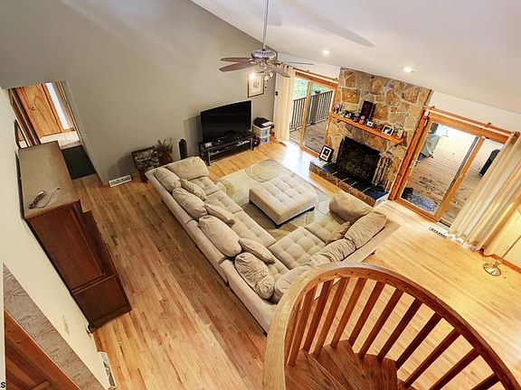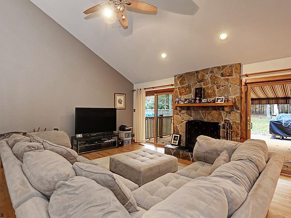 Gorgeous Oversized Ranch w Cathedral Ceilings & Loft. You will fall in love when you drive up to this Stone front ranch with horseshoe driveway and 2 car garage. This 3 Bd/2 Ba home features great room, cathedral ceilings, huge wood burning fireplace w Jersey fieldstone and french doors leading to rear deck. Great room opens to kitchen with granite counters, black stainless steel appliances and tile floor. Large master bedroom with skylights and master bath. Other rooms include dining room, (2) bedrooms, hall bath and laundry room. Spiral steps leading to 2nd floor Loft area with lots of space. Enjoy entertaining outside on the large trek deck, retractable awning, hot tub and more. Located on tranquil wooded lot, fully fenced yard and great curb appeal.