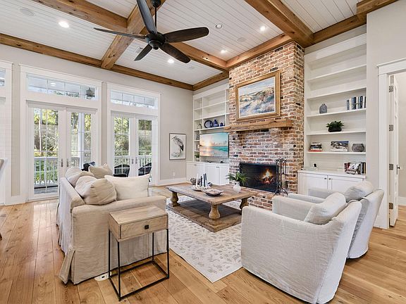 Just a short walk to the beach! This stunning custom-built home in the highly desirable Non Short Term Rental, Sea Dunes subdivision offers privacy, style, and exceptional coastal living on one of the neighborhood's largest cul-de-sac lots the yard is a gardeners dream with mature oaks and abundant Camelias and Azaleas. The private backyard backs up the preserve. Step inside the front door to a grand foyer with a domed ceiling and wood inlay compass rose floor, leading to a stately study with built-ins and beamed ceiling. The open-concept main living with it's 14' beamed ceilings, custom cabinetry, a sound system, and a masonry fireplace is a stunning area perfect for entertaining. The luxurious primary suite features a beamed ceiling, large walk-in closet, and a marble-adorned spa bathroom with double vanities, walk-in shower, and a beautiful freestanding soaking tub. The first floor also has a guest bedroom with full bath, powder room, laundry room, and a 2-car plus golf cart garage.The second floor is comprised of the private guest suite with its own living area with a built-in king-size Murphy kitchenette, bedroom, and full bathWonderful additional guest accomodations.Enjoy the huge front porch or unwind on the screened back porch. Move-in ready and perfectly positioned for the beach lifestylethis is coastal living at its best.