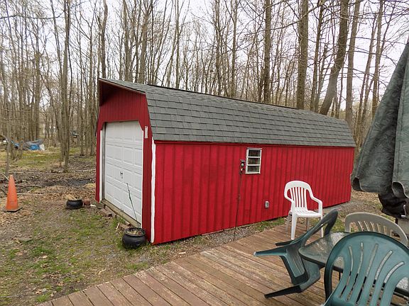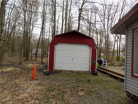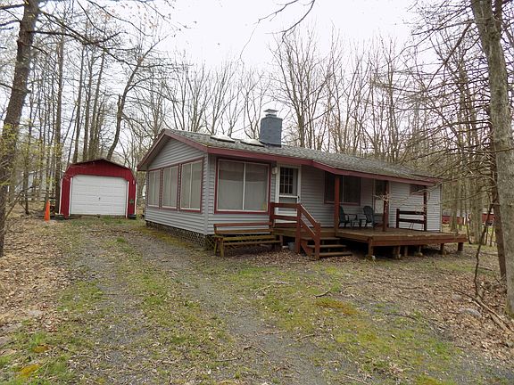 Great Location, appx 500 Ft from heated pool and snack Bar, cozy 2-3 Br, 1 Bath Ranch, Stone Fireplace,large Florida room with propane heat used as 3rd Bedroom, 1 car garage, large rear deck, Super low taxes $1365 per year, Some furniture and all appliances included, would make a super short term rental, or Mountain Vacation home, or Year round living. Owner has put on new roof and done upgrades to crawl space, ready to move in. Located in 5 Lake Mt Community near all major Pocono Attractions