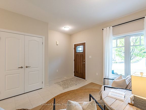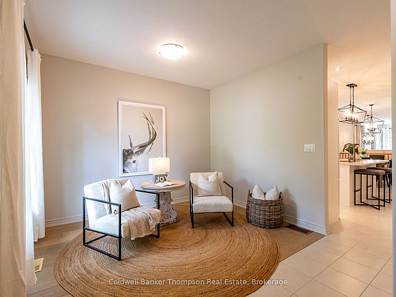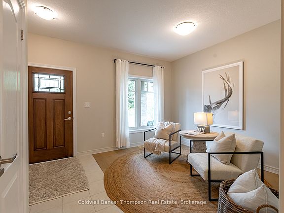 This end-unit bungalow townhouse by Devonleigh Homes blends timeless curb appeal with thoughtful interior design. Its exterior showcases a harmonious mix of stone, brick, & vinyl siding in soft neutral tones. The welcoming covered porch has an invisible screen at the front door, perfect for enjoying fresh air throughout the home. Step inside to a bright foyer with a flexible bonus space at the front of the home. This area is ideal as a den, sitting room, or office. The open-concept kitchen, dining, & living areas extend beyond, creating a seamless flow for everyday living & entertaining. The kitchen is well-appointed with matching white appliances, including a natural gas cooktop stove. It also offers a spacious island with sink & breakfast bar overhang for extra seating. Sleek white subway tile backsplash & under-cabinet valance lighting add warmth & style. The living room features sliding doors that lead to a private rear yard with mature trees, stone patio, & privacy fencing on one side. Thanks to its end-unit position, the home is filled with natural light from extra windows. Off the main living area lies a generous primary suite with walk-in closet & 4-pc ensuite. The ensuite features a step-in bathtub & separate shower. There is convenient inside entry from the single-car garage. A main floor laundry room with a sink & a nearby 2-pc powder room, add convenience to everyday life. Downstairs, the finished lower level extends the living space with another bedroom that has doors to a private den, ideal for guests or hobbies, along with a spacious rec room & a 3-pc bath. Theres also abundant storage, ensuring everything has its place. Comfort is enhanced by forced-air natural gas heat, central air, municipal water & sewer, fibre-optic internet & curbside garbage collection. This appealing property sits in a welcoming community close to shopping, dining, recreation & everyday amenities, offering a stylish, low-maintenance lifestyle with the feel of a detached home.