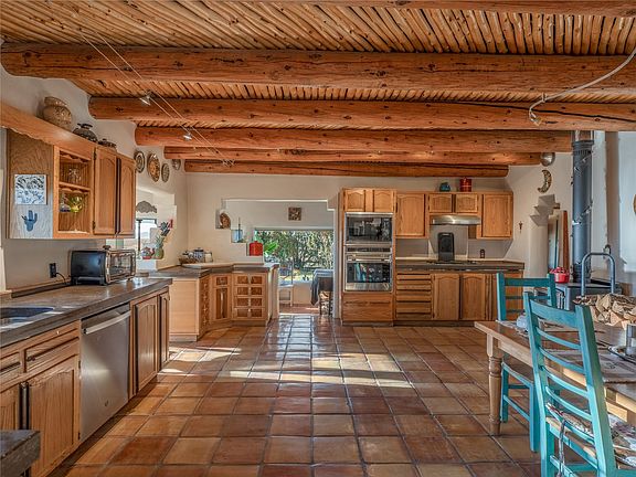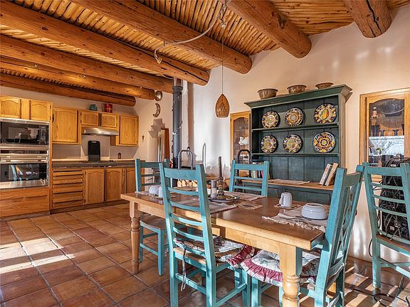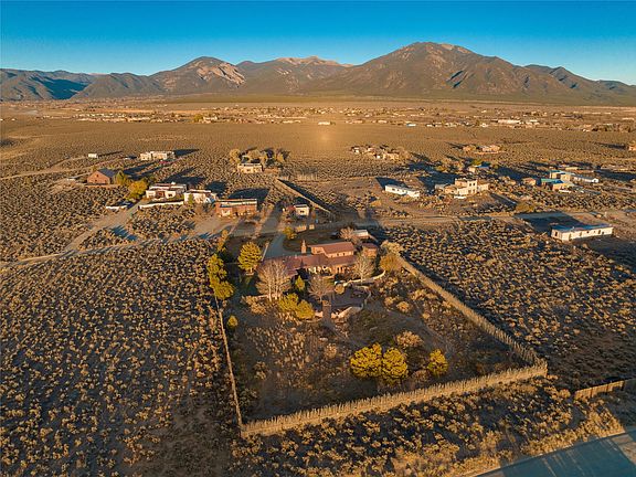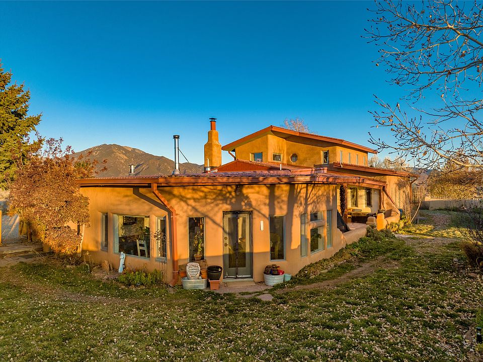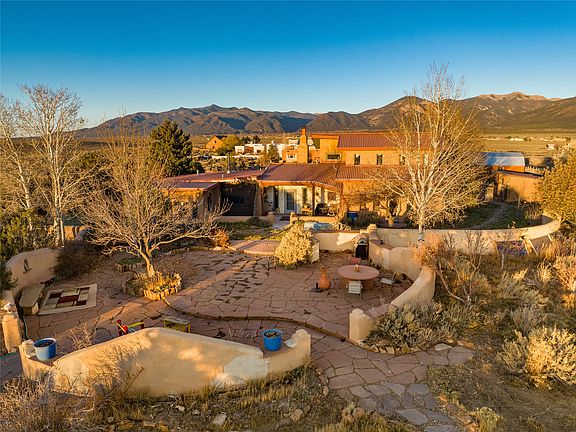 Seek and you shall find delightful Southwestern comfort at 36 Shadow Mountain Road! This true adobe construction on 1.02 acres has unique style with big mountain vista views. Traditional Southwest features like viga and latilla ceilings, Talavera tile, and saltillo tile floors can be found around every corner of the generous, sunlit floor plan. The voluminous kitchen is built to handle those boisterous family meals with sturdy concrete counters with custom inlays, full size appliances, and plenty of room for seating. Enjoy quiet evenings watching the sunset from the cozy sunroom, or make it your own private botanical garden space. A generous living area, primary bedroom, and a guest room with its own private entrance complete the main level, along with a full bathroom outfitted with a large soaking tub, custom double talavera sinks, and punched-tin light fixtures. A private upstairs room with a full bathroom offers space for another bedroom, office work, or hobby room. The backyard includes adobe walls and extensive rock work, latilla fencing for privacy, and drip irrigation plus a sprinkler system in the immediate backyard. There’s also an insulated detached studio with electric heater and a railed covered deck, as well as an adobe well house, which has a utility sink, hot water, and electric on the property. Just 15 minutes from the town of Taos! Surround yourself with iconic Southwestern vibes with 36 Shadow Mountain Road!