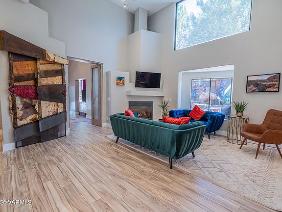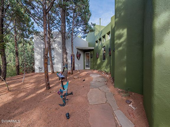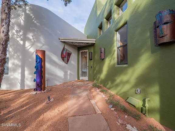 ARTISTS RETREAT: This modern, custom-designed home is the perfect place to inspire creativity or highlight your art collection. On an oversized, half-acre lot, this light-filled home offers many delightful surprises. The Living room tiered ceilings soar up to 16-feet with mountain views of Sedona's Elephant Rock. Love to entertain? A chef's kitchen with skylights, a sub-zero fridge, 6-burner built-in Viking range, double ovens, and spacious granite bar open up to a dining room with a table custom fit for the space. Just off the living room, another surprise awaits with a covered outdoor studio with sliding metal doors, ideal for yoga retreats, creative workshops, entertaining and more. Top quality construction by Joel De Tar, thick high walls towards the road, results in a peaceful home. All around custom ironwork, multiple one-of-a-kind sculptures and custom crafted tile-work enliven the space. Outside the guest bedroom you will find a relaxing spa tub that is included with the home. All furnishing and artwork available on a separate bill of sale. Currently operating as a successful STR.