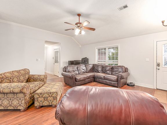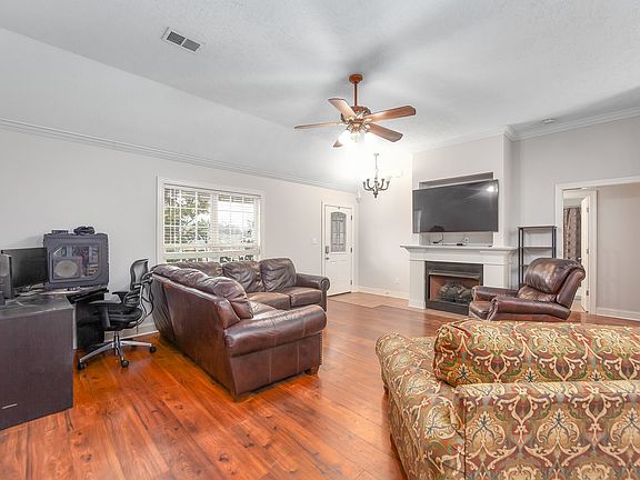 Spacious open floor plan! Laminate hardwood throughout, tile in kitchen & baths. Fresh paint. Large breakfast bar in the kitchen. Trayed ceiling in the primary bedroom. Covered front porch, covered back patio and fenced backyard. Located in a cove.