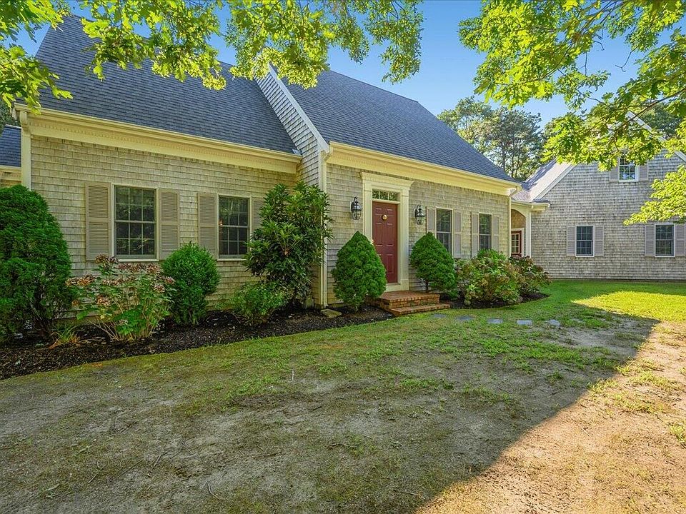 Youll likely find yourself singing the familiar refrain of Strawberry Fields forever after viewing this delightful 4 br/2.5 ba Cont. Cape in the Strawberry Fields subdivision of E. Dennis. This attractive home is central to everything that Dennis has to offer, and is perfectly sited at the end of a cul-de-sac in a neighborhood of fine homes. It offers spacious rooms with high ceilings throughout, a 1st floor Primary bdrm suite, beautiful wide pine floors, a 3 car garage.....the list goes on and on. The 1st level is accentuated by a fabulous cathedral ceiling Great rm that opens to the adjoining kitchen w dbl ovens and richly-hued cherry cabinets, an adjacent 3-season Sun rm that leads out onto a generous deck, a large Dining rm, an oversized mudroom that includes addl pantry space and laundry area w 1/2 bath, and a sizeable ensuite bedroom with a cavernous private bath w Palladian window and jetted tub. The 2nd level features 3 more substantial bedrooms w ample closet and eave storage serviced by a full bath. Outside the grounds teem with seasonal color....enjoy the large deck--great for entertaining family and friends, and theres a Cape prerequisite--an outdoor shower