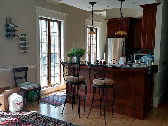 Modern and high end condo on Strong Avenue Northampton. From bike path entry opens up to wide entry with coat closet, double glass door to large living room with gas fireplace, many windows and nice hardwood floors. Doors to dining area that flows into modern kitchen with granite counter tops - has flat top electric stove, dishwasher and refrigerator- washer/dryer combo. Unit has large bedroom with great closet and storage space and full bath. Second full bath off hallway. Front common entry from Strong Avenue. Unit has intercom system to ring in guest and an alarm system that can be hooked up. Included in rent- lawn care, snow removal, water and trash removal and storage unit in basement.