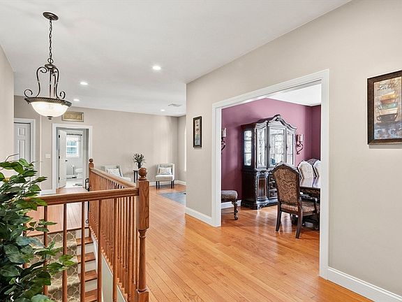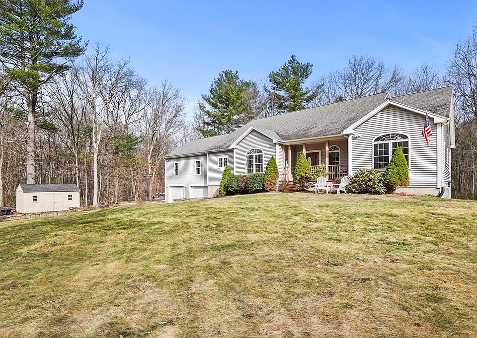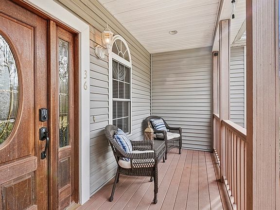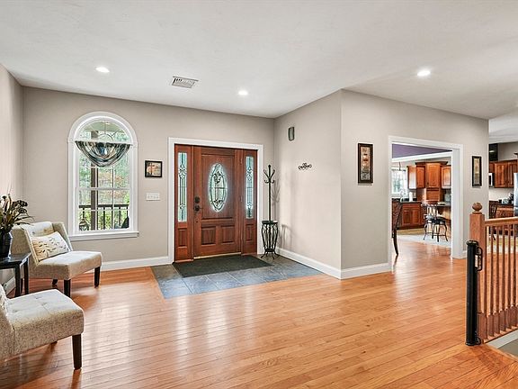 Welcome to this beautifully updated 4BR/3BA contemporary ranch offering an open floor plan, premium finishes, and unmatched privacy on 5+ acres. The grand foyer welcomes you with 9-foot ceilings, gleaming hardwoods, and beautiful natural sunlight. The chef’s kitchen boasts a gas stove, cherry cabinets, black granite countertops, and a large island, flowing seamlessly into the dining area. The spacious living room features vaulted ceilings, a striking floor-to-ceiling stone fireplace, and a slider leading to the oversized deck. The main level offers three bedrooms, a private office, as well as a luxurious primary suite with a walk-in closet and spa-like ensuite. The lower level is ideal for guests or an in-law setup, complete with a full kitchen, living room, walk-in shower, and separate laundry, plus French doors opening to a recently constructed stone patio & fire pit. Tucked away at the end of a long driveway, this private retreat blends modern convenience with tranquil surroundings.