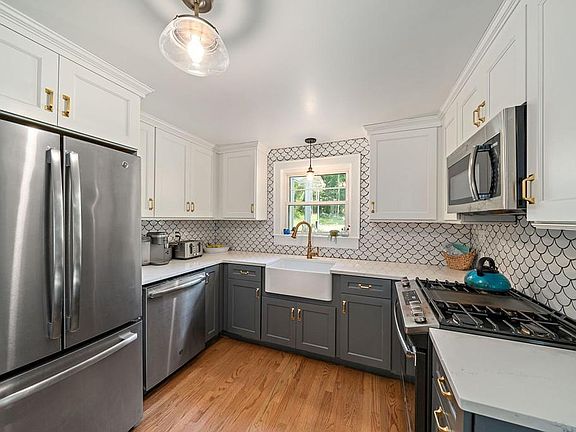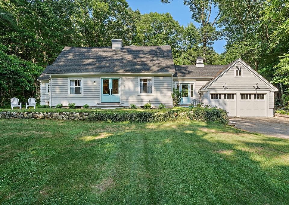 Remodeled 3 bed/2 bath Cape that sits tucked back from street on beautiful 2.34 acre wooded lot. 2 beds up share a full bathroom, 3rd bedroom on 1st floor with a second full bathroom. Bonus room on 1st floor can be 4th bedroom, family room, playroom, den... Hardwood floors throughout have just been refinished and look beautiful! Both bathrooms were remodeled down to the studs. w/ New: plumbing, bathtubs, tiled shower walls, vanities w/ marble tops, toilets, fixtures, lighting, ceramic tile flooring and ship lap walls. Brand new kitchen with Shrock wood soft close cabinets, quartz counter tops, farm sink, gold faucet and hardware, stainless steel appliances, lighting, gas cooking (by propane) and a breakfast bar that opens to dining room. New roof in 2019. All new exterior doors and Hardware. Newer lighting throughout. Brand new mahogany wood deck and front steps. Huge mudroom w/ laundry and tiled flooring. 2 car garage is heated w/ newer garage doors and 2nd floor storage room.