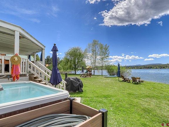SITTING ON ONE OF THE LARGER LOTS ON LAKE PAGOSA WITH LAKE FRONT VIEWS AND ACCESSIBILITY. This sunny, bright almost 1350 sq. ft. lakeside home sits on .33 of acre with its’ own fishing dock and lush green grassy back yard which is partially fenced for pets or kids. OWN YOUR OWN BOAT DOCK ON THE LAKE. FISH in the stocked fishing lake 365 days a year from your back yard or your own dock. Take your kayak from your own launch for a paddle around the lake. PAGOSA SPRINGS, CO has fewer and fewer lake front lots available, especially on the more desirable Lake Pagosa. This adorable lake side home has 3 bedrooms, 1 and 3/4 baths, 2-car tandem garage with storage. Plenty of approved parking for all your cars, trailers, or RV. This home has plenty of room on this .33 acre to add on. A Major Remodel was done in 2016 and even more upgrades have been made recently, which included granite counter tops throughout, stainless appliances, hardwood flooring and paint. The vaulted ceilings with rustic beam accents make it feel open and sunny with big windows facing Lake Pagosa. GREAT COVERED BACK DECK OVERLOOKING THE LAKE AND CHRIS MOUNTAIN RANGE TO THE WEST. Enjoy beautiful GREAT WEST FACING SUNSETS from the bar on the covered porch!! This home would make a great short-term rental if desired. As a bonus the Pagosa Area Water District allows limited (yard) watering rights from the lake for a small yearly fee. Grab your fishing pole, paddle board, kayak, canoe or just go relax by the lake on one of the larger lake-front yards in the area. PAGOSA SPRINGS, CO. is the home of the HEALING WATERS HOT SPRINGS, WOLF CREEK SKI AREA and the SAN JUAN RIVER and 1000's of acres of the SAN JUAN NATIONAL FOREST along with WILDERNESS AREA.